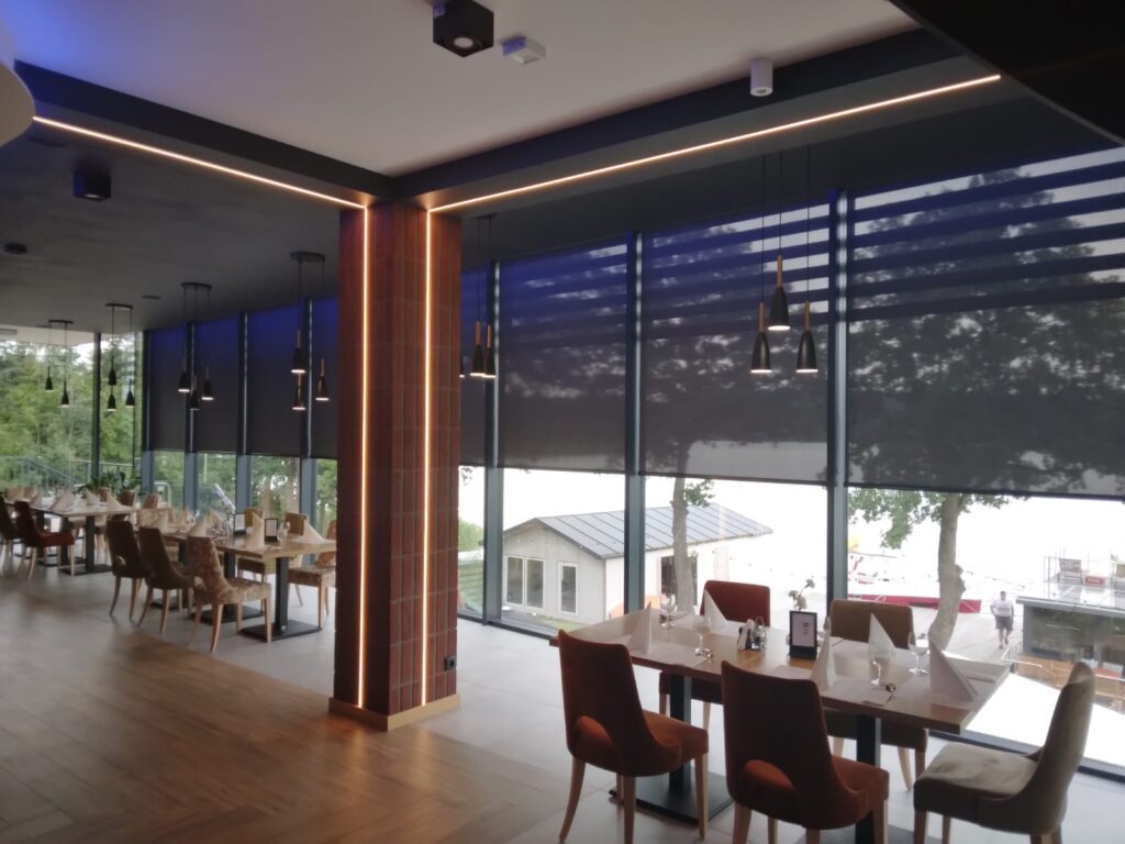 Żaluzje fasadowe, powstrzymują większość promieni słonecznych bezpośrednio wpadających do wnętrza, skutecznie zabezpieczają pomieszczenia przed nagrzaniem oraz stwarzają korzystne warunki optyczne. Dodatkowo, swoboda regulacji kąta nachylenia listew umożliwia wybór odpowiedniego stopnia zaciemnienia.